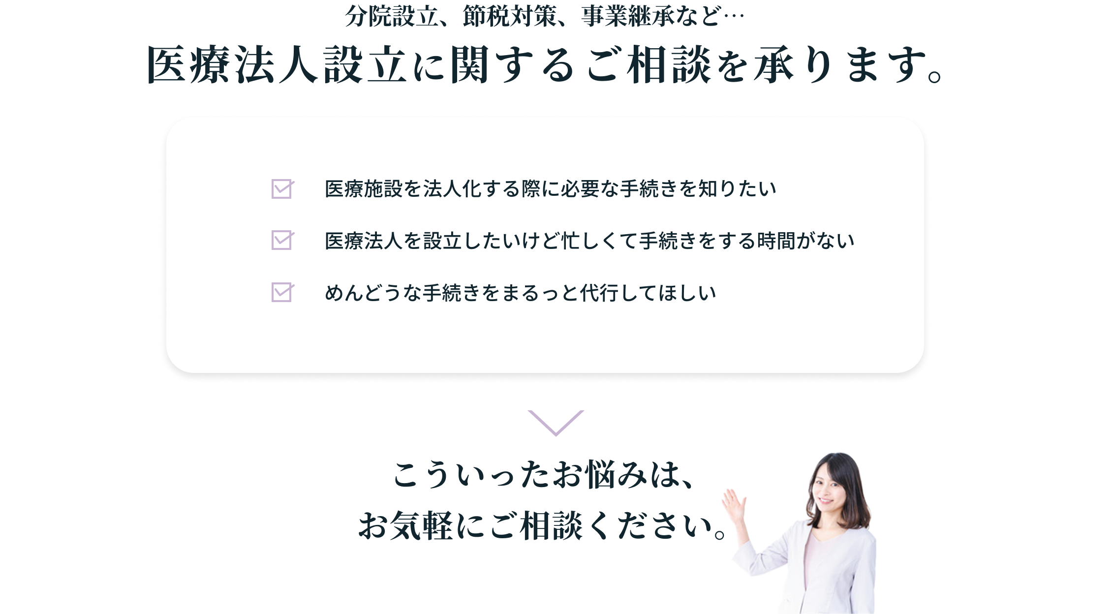 医療分野や法人設立に関する行政手続きはお問い合わせください。